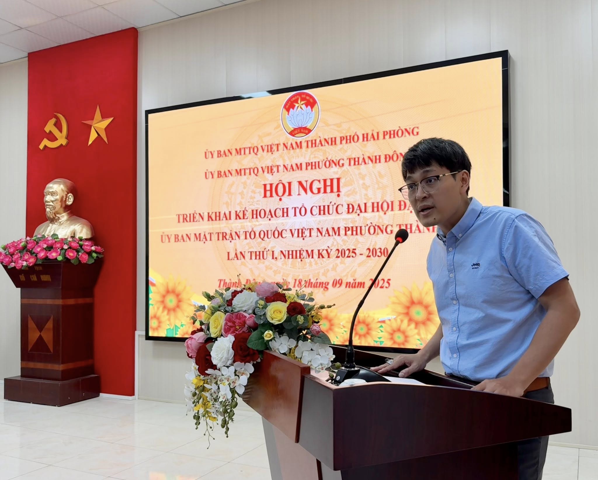 Ngày 18/9, UB MTTQ Việt Nam phường Thành Đông tổ chức Hội nghị triển khai kế hoạch tổ chức Đại hội đại biểu MTTQ Việt Nam phường lần thứ I, nhiệm kỳ 2025 - 2030. Tham dự có đồng chí Phạm Minh Thăng - Phó Bí thư thường trực Đảng ủy, đồng chí Hoàng Đức Tuấn - UVBTV Đảng uỷ, Chủ tịch UB MTTQ Việt Nam phường