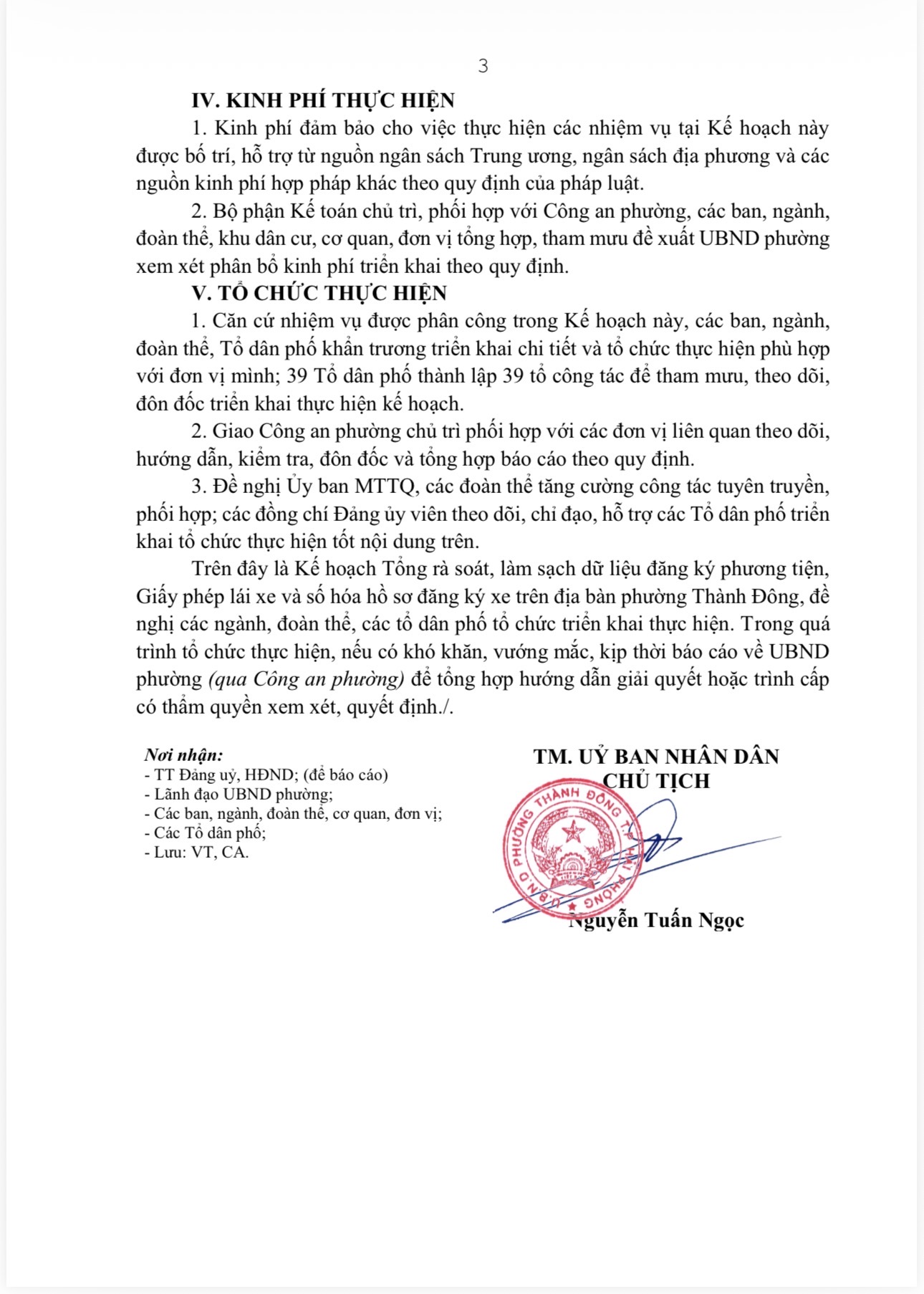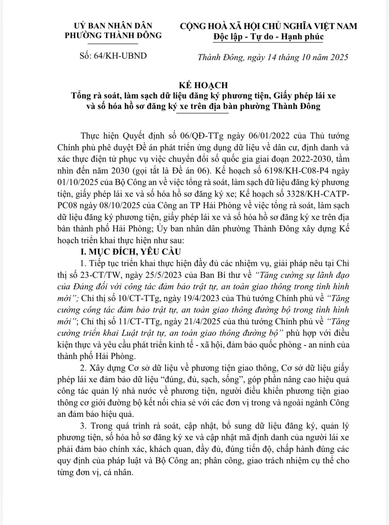 KẾ HOẠCH Tổng rà soát, làm sạch dữ liệu đăng ký phương tiện, Giấy phép lái xe và số hóa hồ sơ đăng ký xe trên địa bàn phường Thành Đông