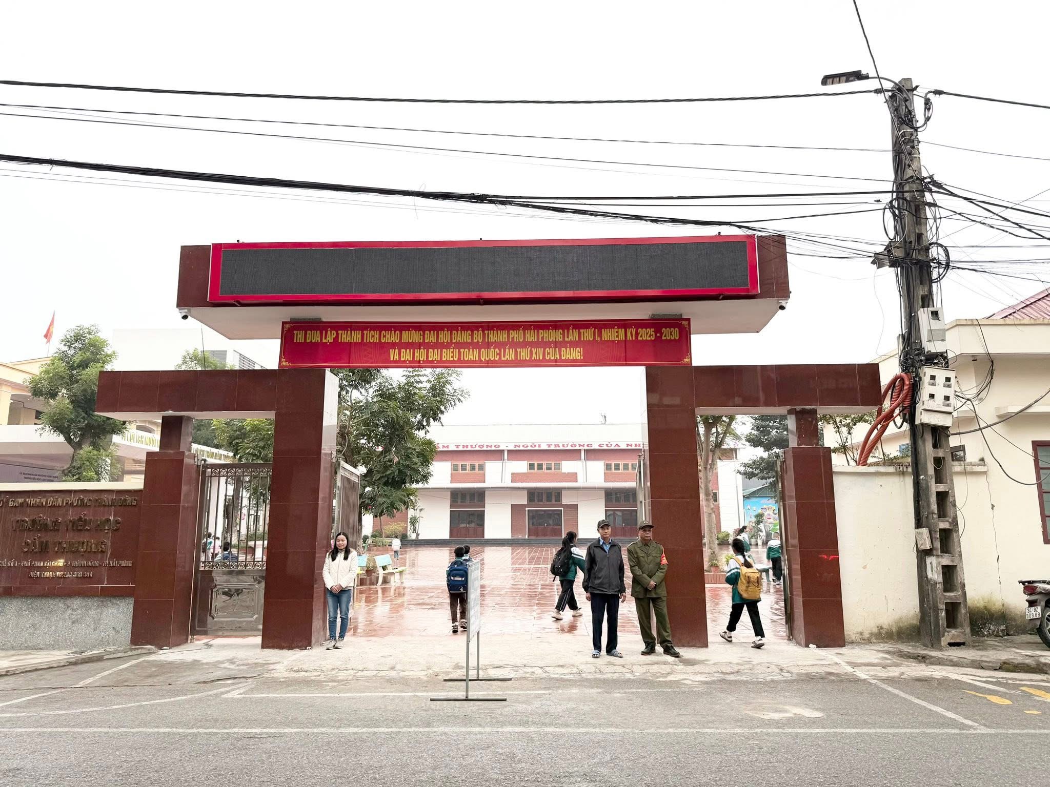 Lực lượng an ninh cơ sở phường Thành Đông hỗ trợ nhà trường trong công tác giữ gìn trật tự, an toàn giao thông cổng trường.