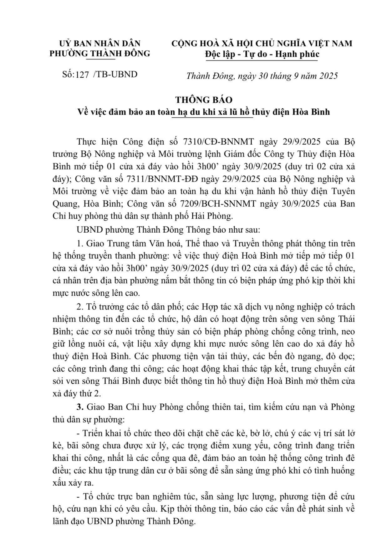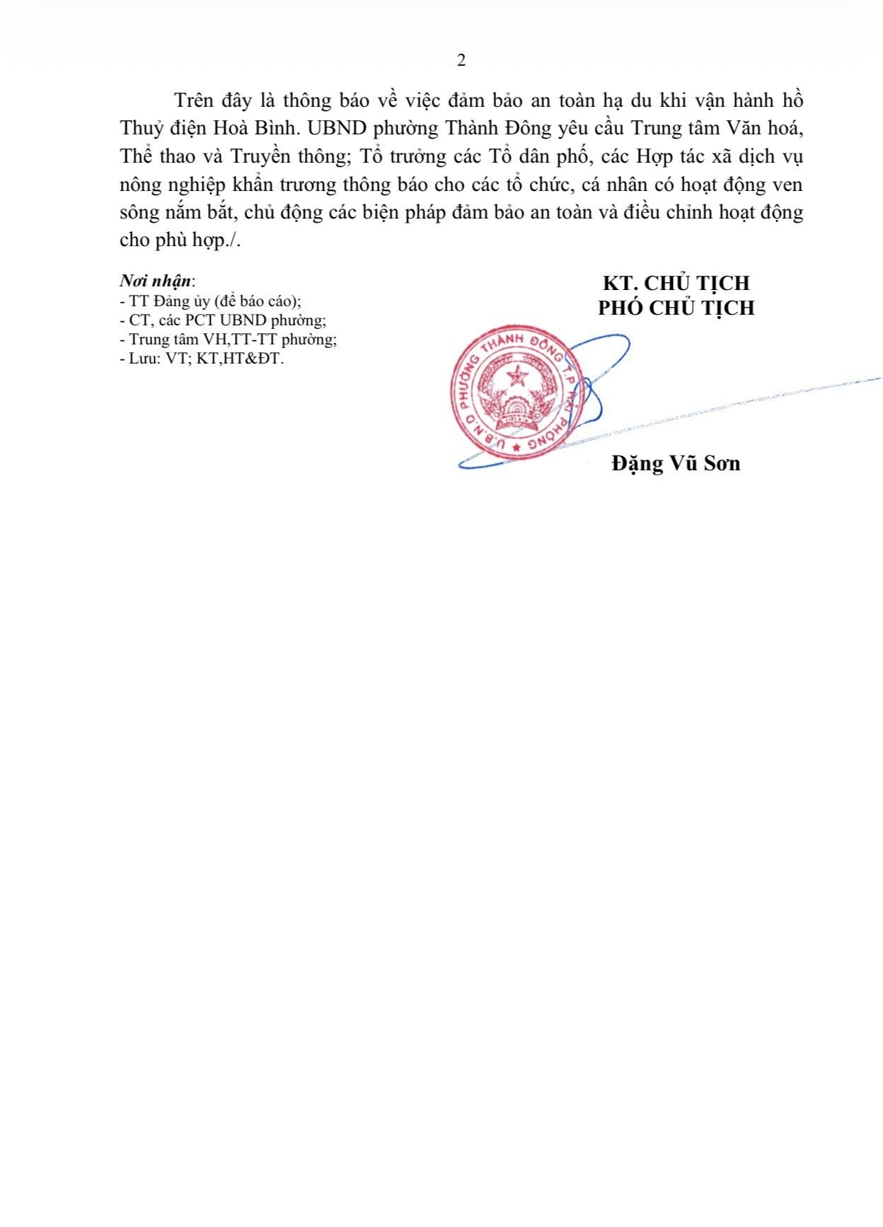 THÔNG BÁO VỀ VIỆC ĐẢM BẢO AN TOÀN HẠ DU KHI XẢ LŨ HỒ THUỶ ĐIỆN HOÀ BÌNH