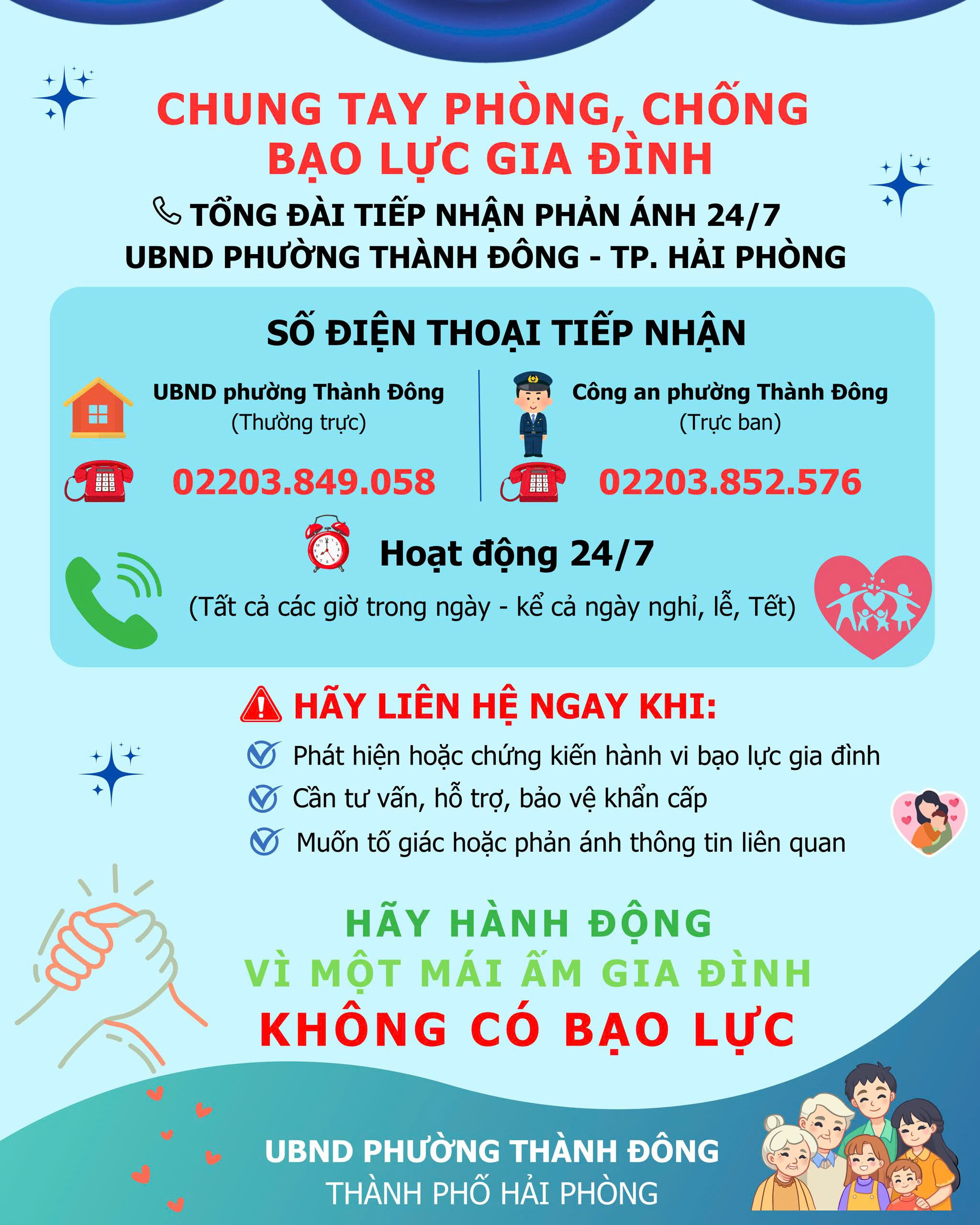 Thực hiện phong trào toàn dân chung tay đẩy lùi bạo lực, UBND phường Thành Đông thông báo công khai đường dây nóng tiếp nhận phản ánh 24/7, nhằm bảo vệ kịp thời quyền lợi và sự an toàn của nhân dân.